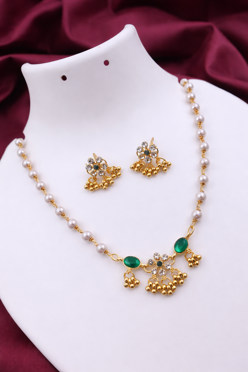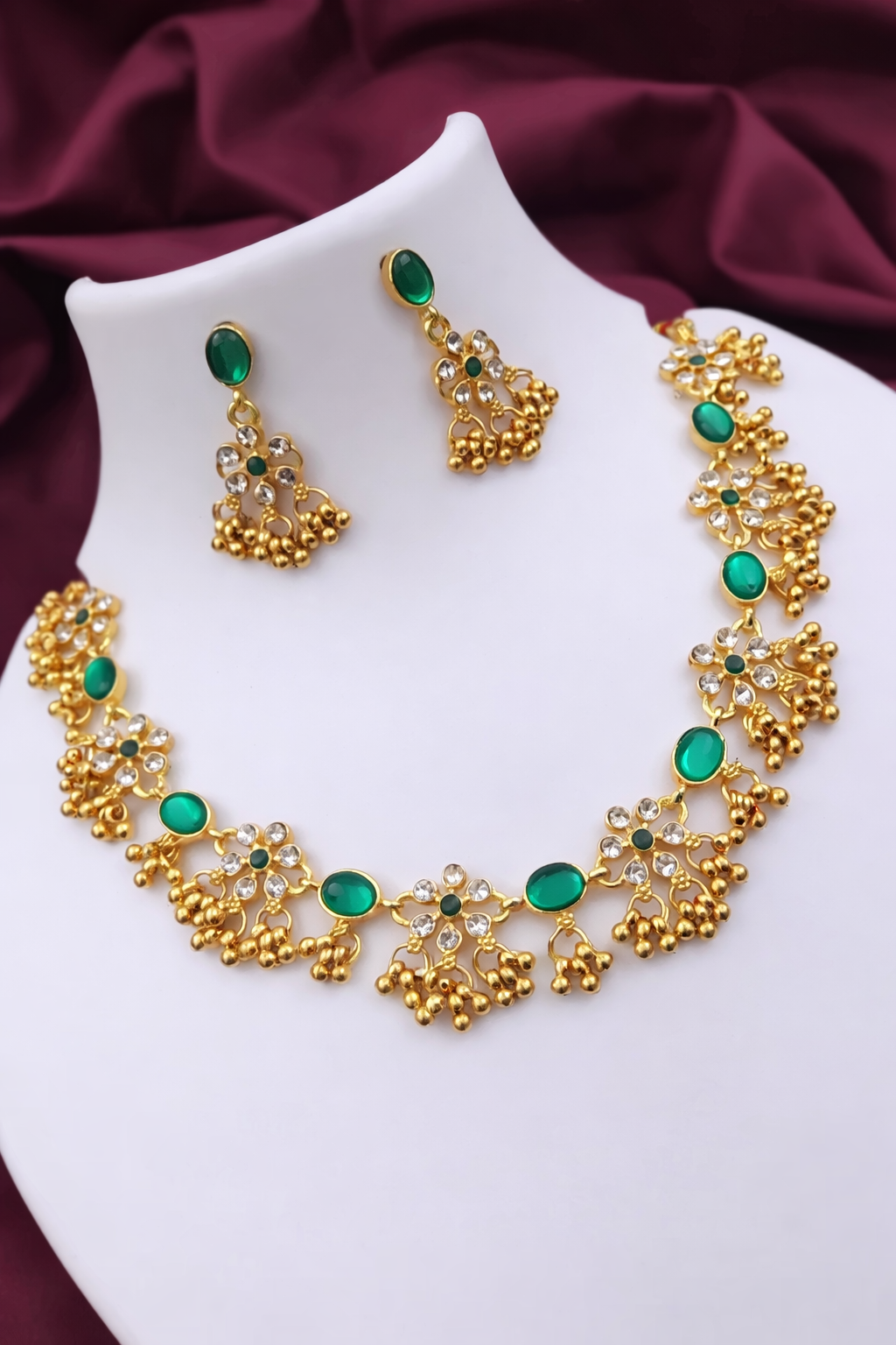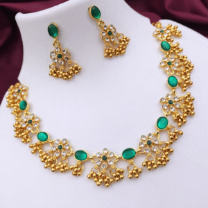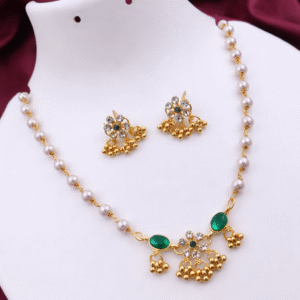 Add timeless elegance to your ethnic look with this Fancy Matte Finish Diva Necklace Set, crafted for women who love a blend of tradition and modern charm. Designed in a rich gold-plated matte finish, this jewellery set features exquisite detailing with green stone accents and delicate pearl work, giving it a luxurious temple-style appeal.