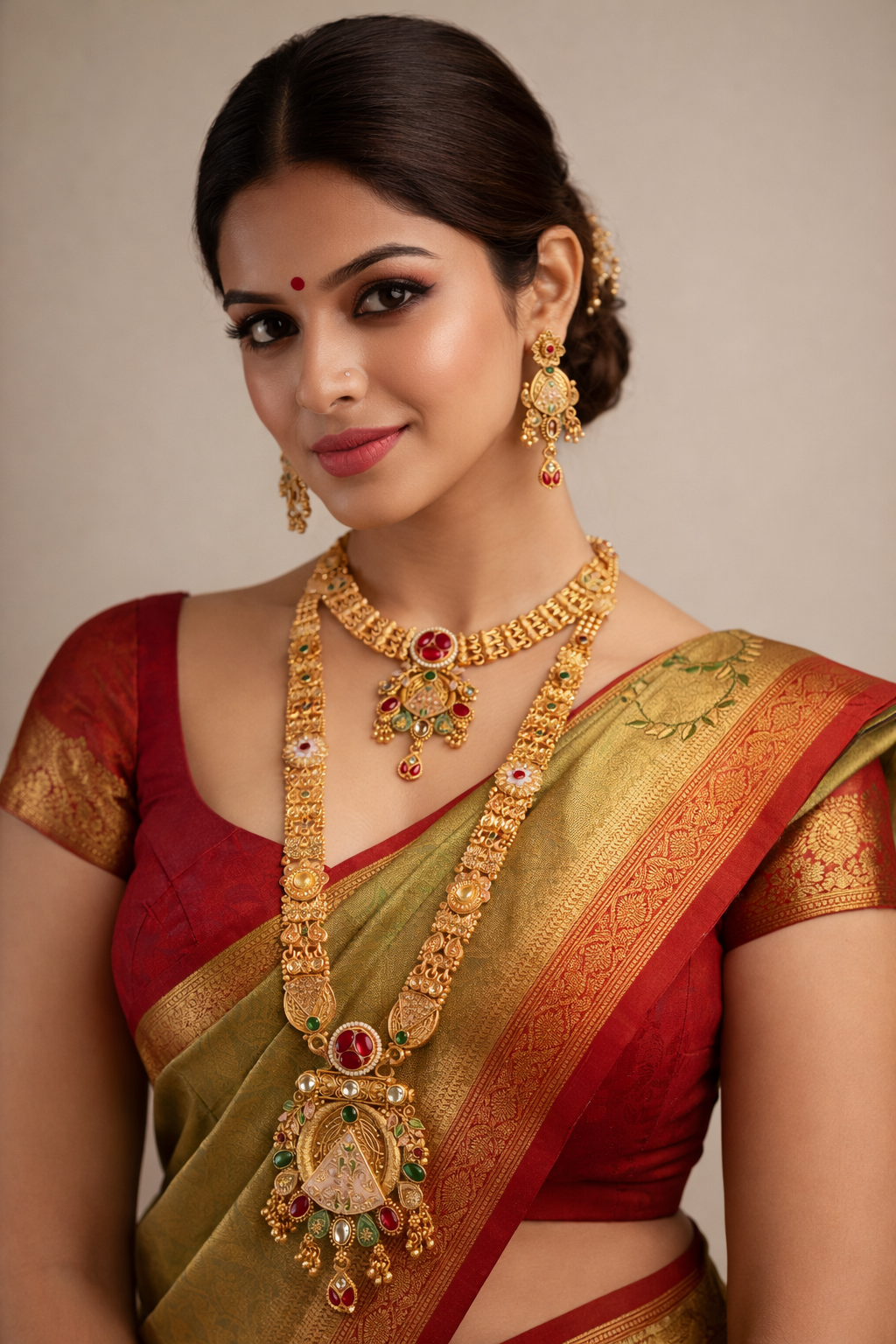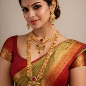 This beautifully designed combo includes a long necklace, classic hasli necklace, and matching earrings, finished in a rich matte gold tone with red and green stones that enhance its royal appeal. Perfectly complements silk sarees, lehengas, and ethnic outfits for weddings, festivals, and special occasions.